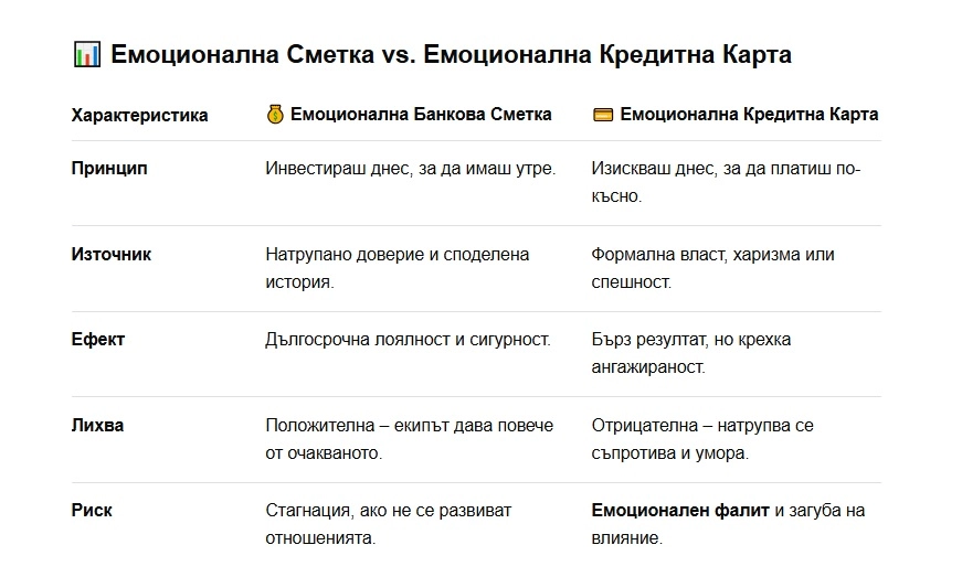 В Академия „ВИЗИОНЕРИ“ изследваме класическата концепция за Емоционалната банкова сметка като място, където трупаме доверие чрез търпеливи депозити. Но в света на високите скорости и мигновените резултати, лидерите често посягат към един по-опасен инструмент: Емоционалната кредитна карта.